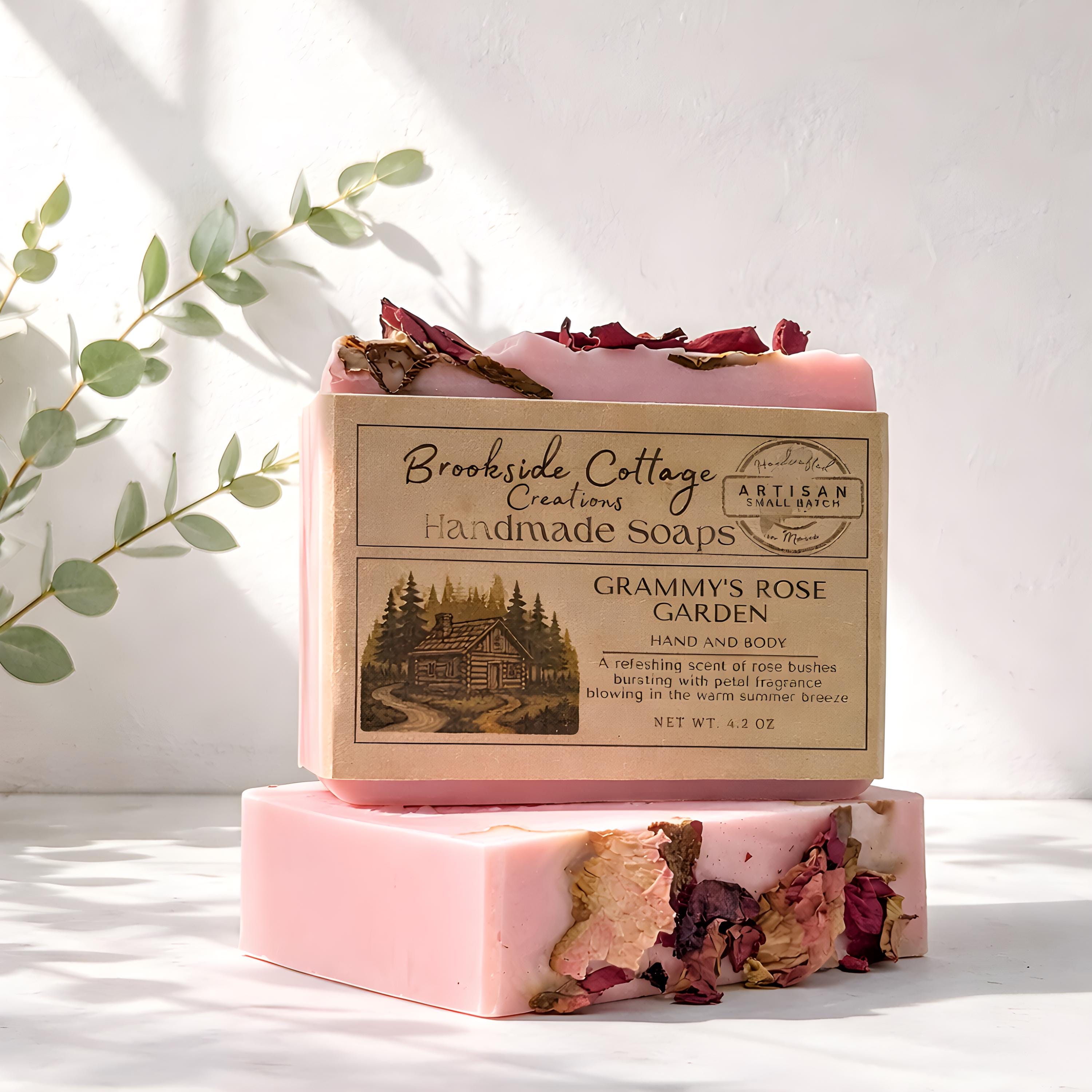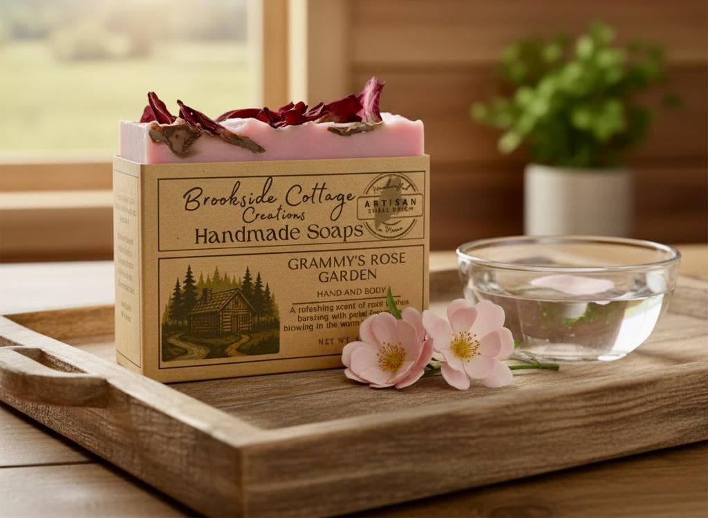 This handmade rose soap bar features a soft, classic floral scent inspired by cottage gardens. Crafted in Maine, it offers a gentle cleanse and timeless appeal.
