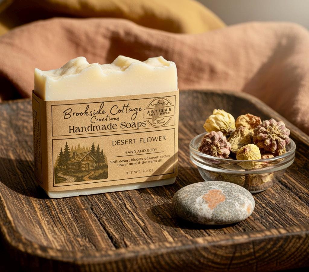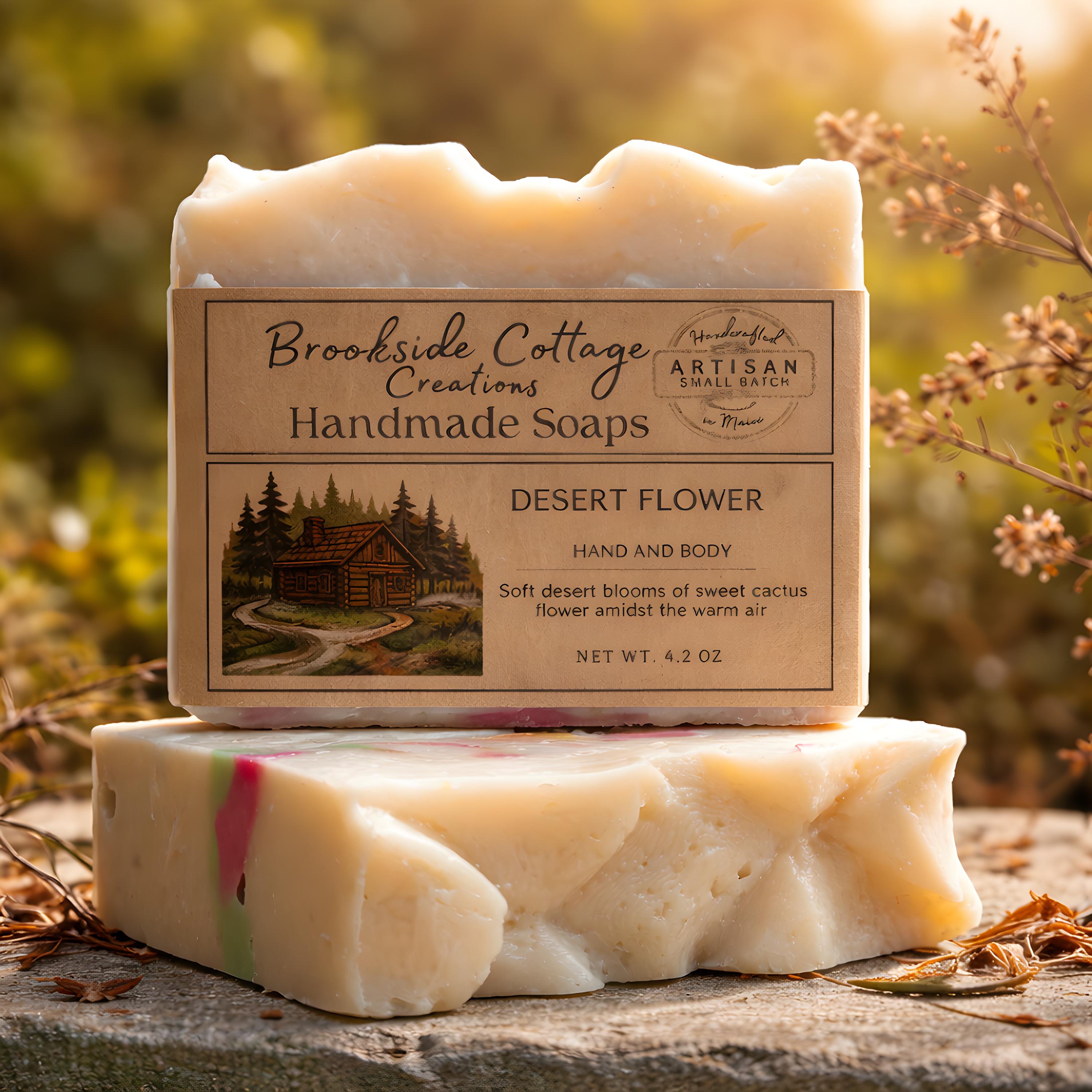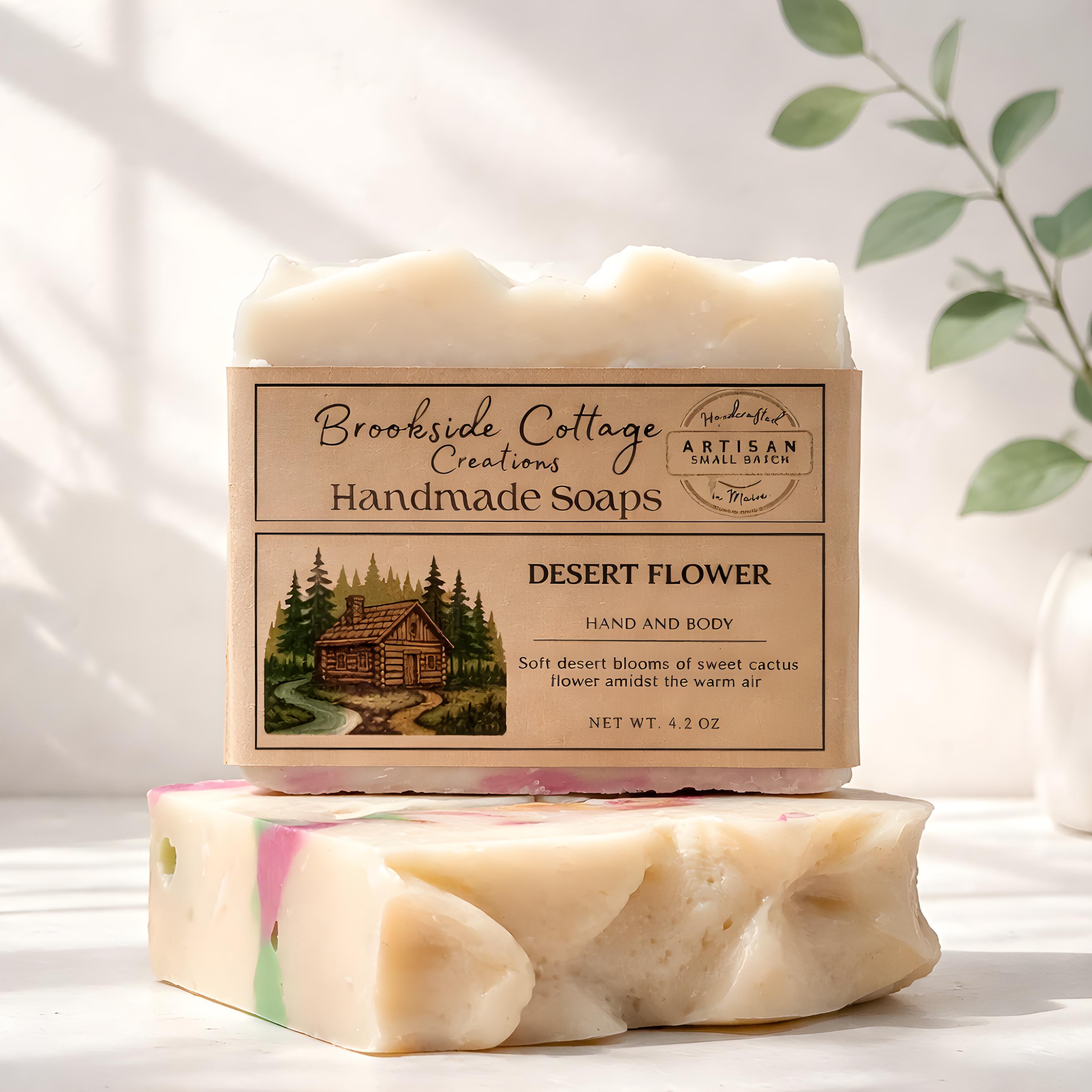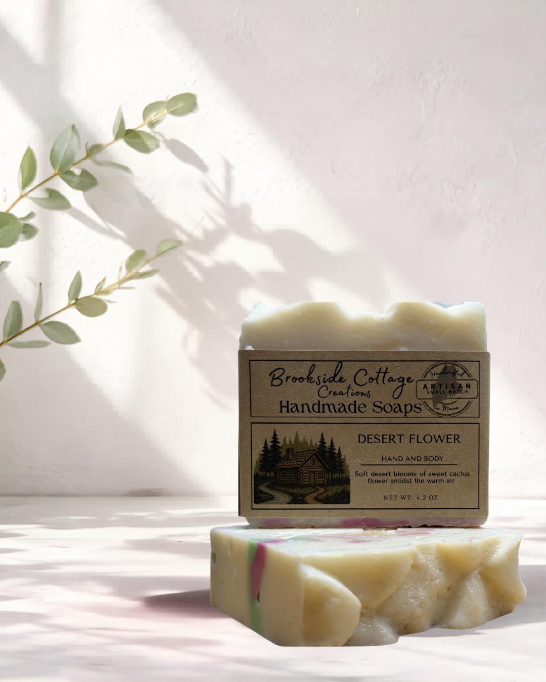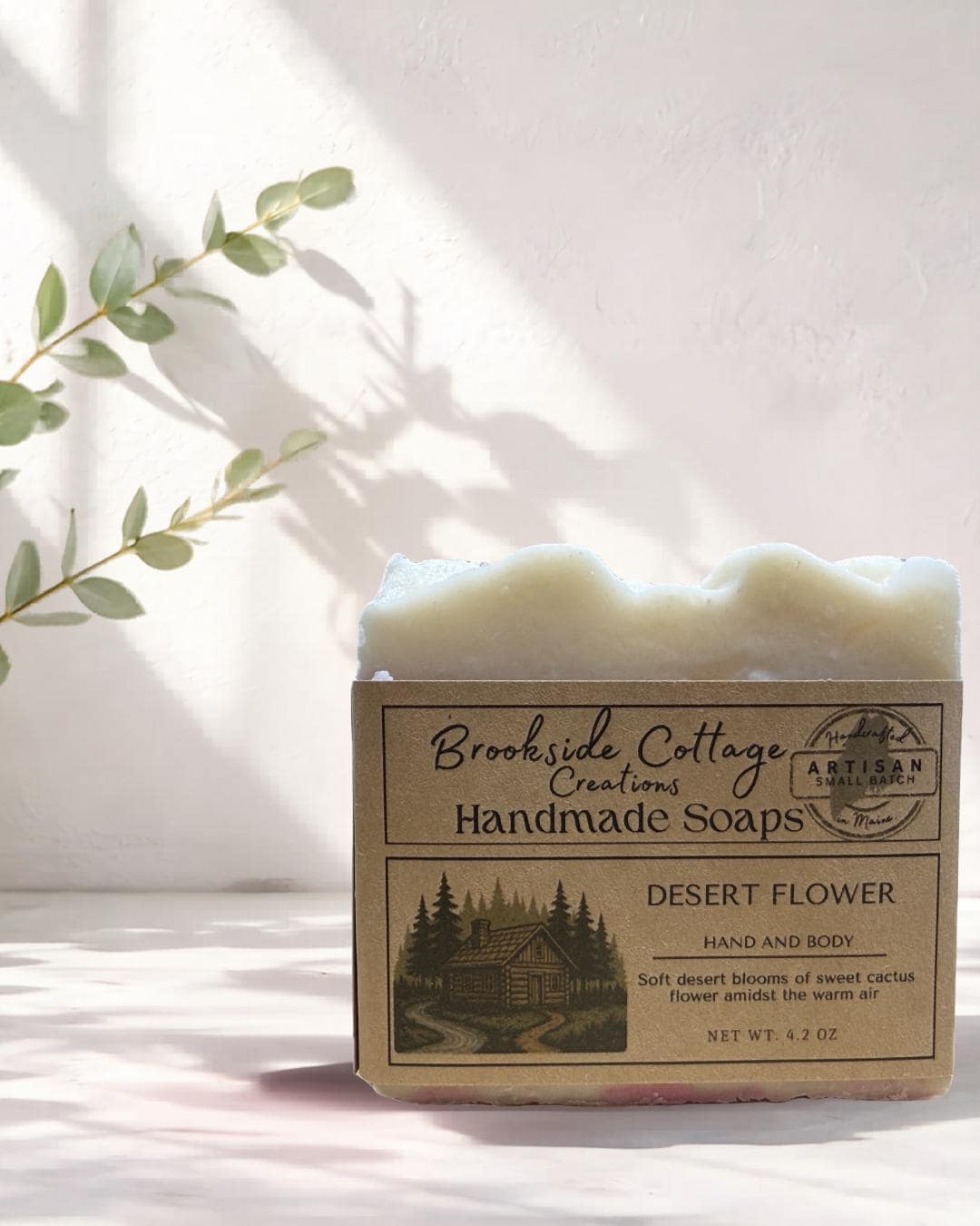 Desert Flower is a handmade cold process soap bar with a soft floral, desert-bloom inspired scent. Crafted in small batches in Maine for a smooth, gentle cleanse.