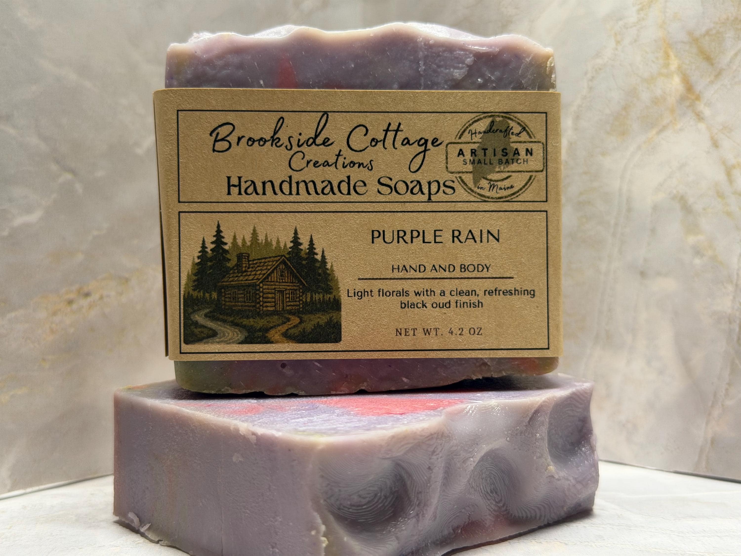This handmade floral soap bar pairs light florals with clean black oud for a fresh, elegant scent. Crafted in Maine for a smooth, modern bathing experience.