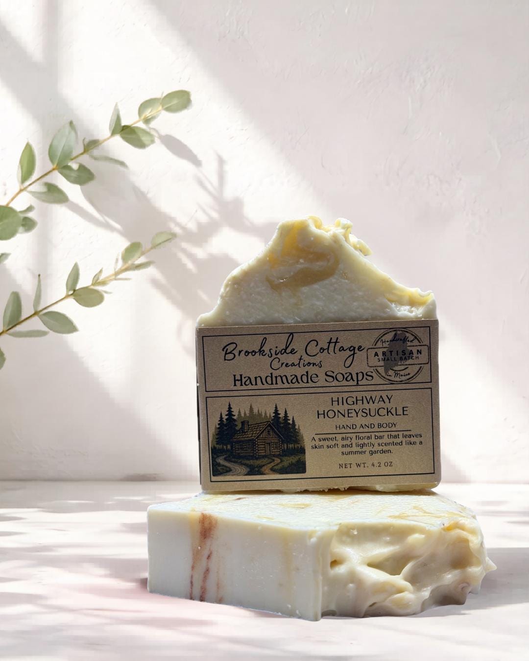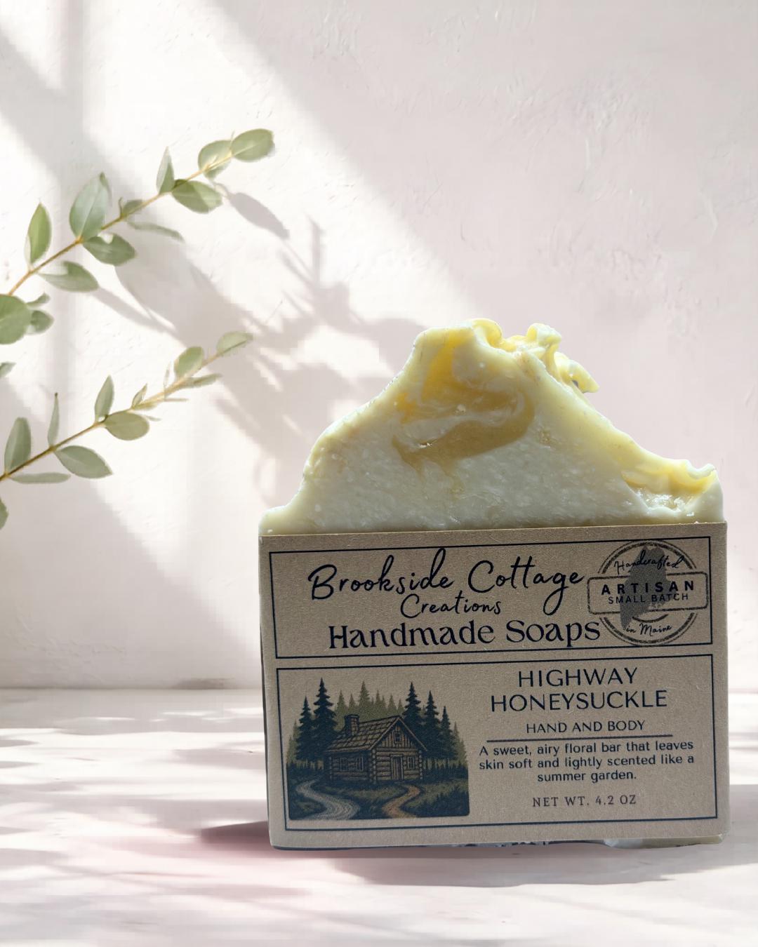 This handmade Honeysuckle cold process soap bar is crafted in small batches in Maine with a rich, creamy lather and a sweet floral scent. Perfect for gifting or adding a cozy, dessert-inspired touch to your daily routine.