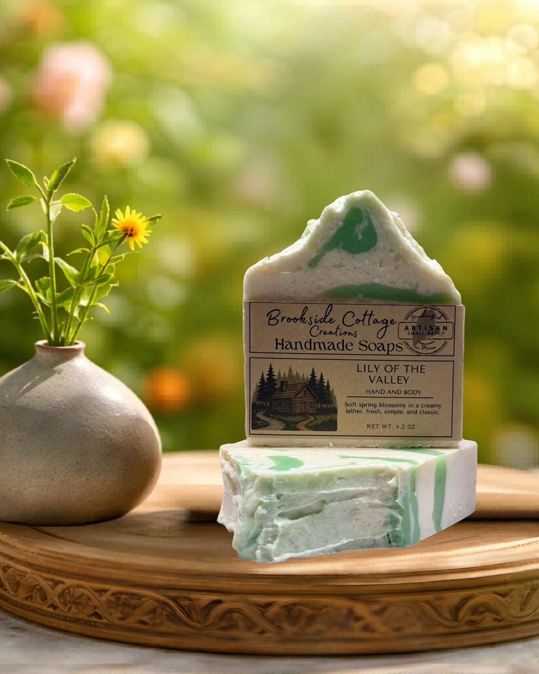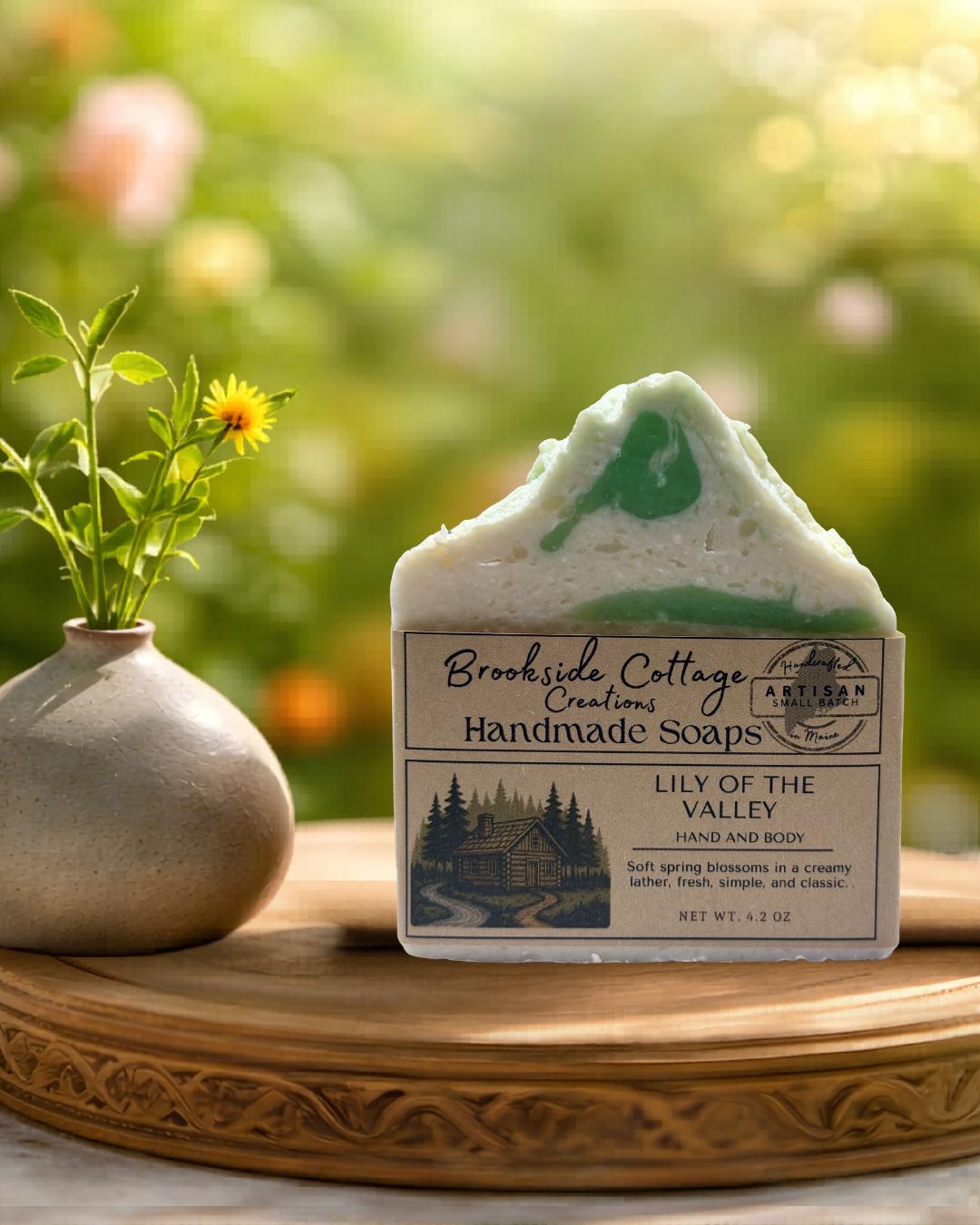 This handmade Lily of the Valley cold process soap bar is crafted in small batches in Maine with a rich, creamy lather and a sweet floral scent. Perfect for gifting or adding a cozy, dessert-inspired touch to your daily routine.