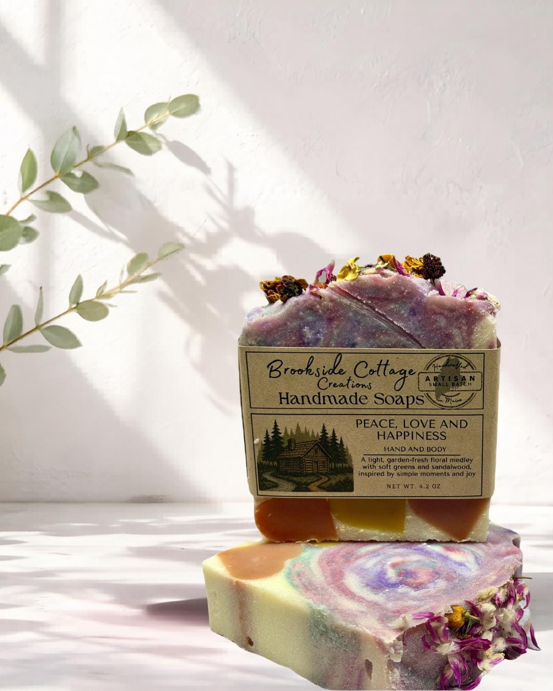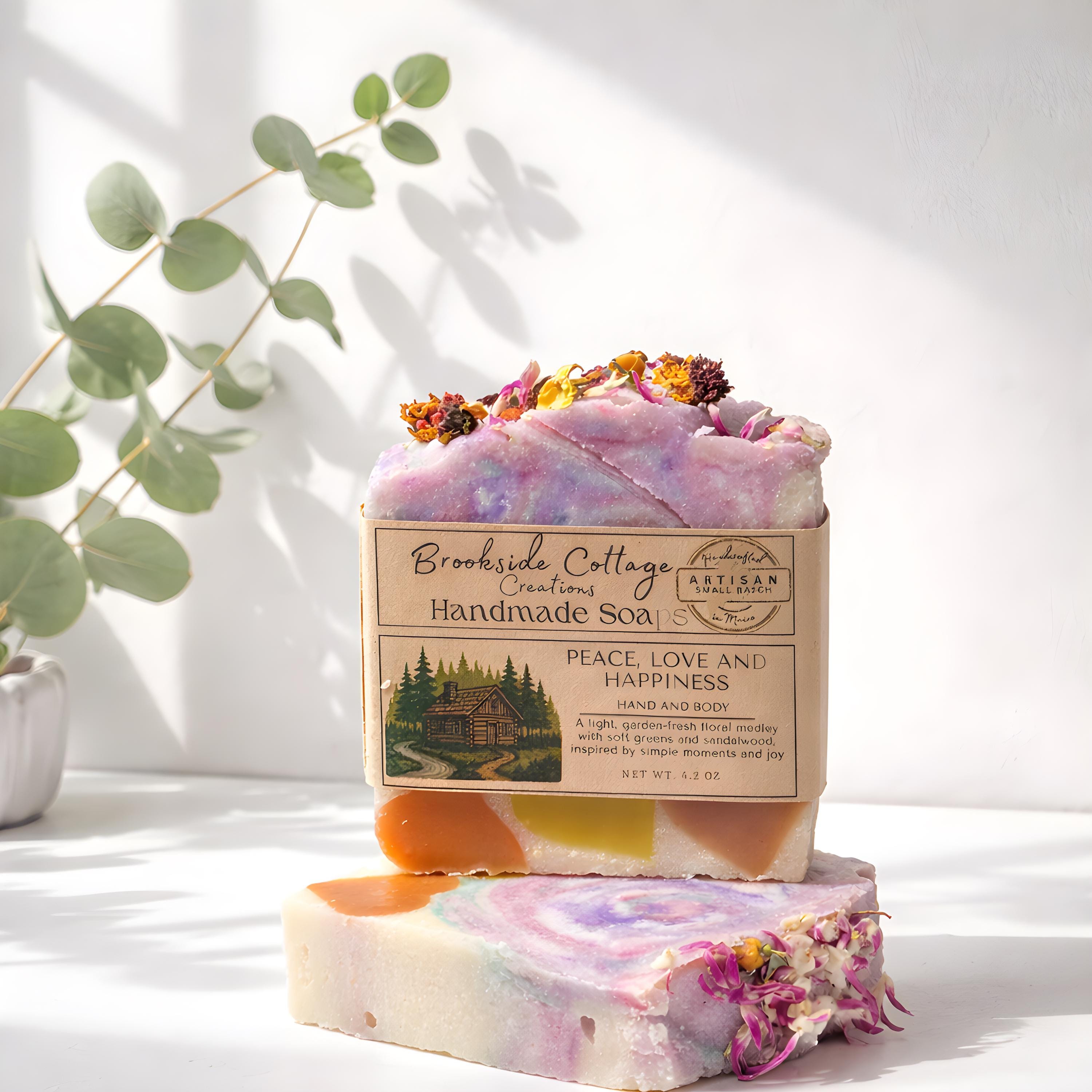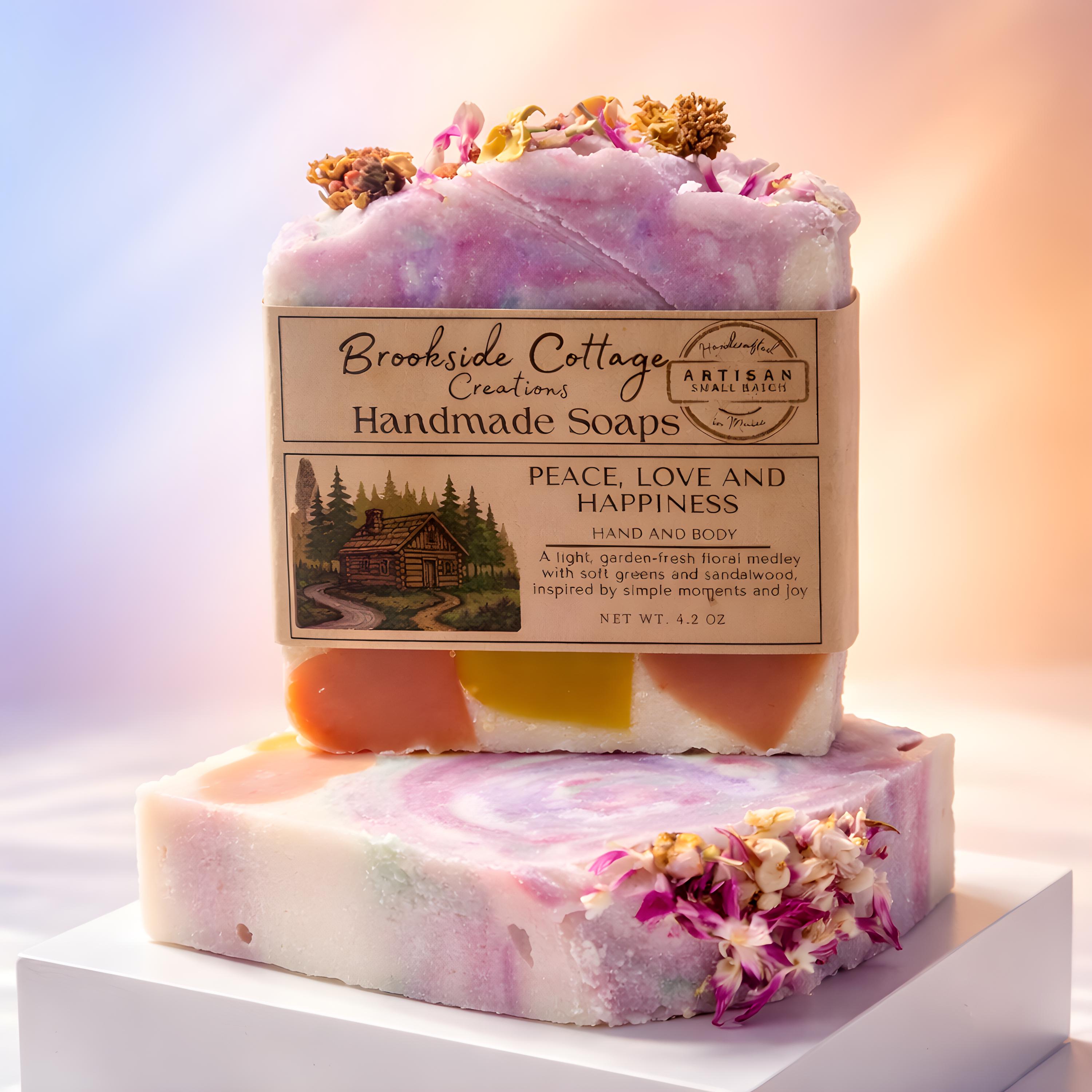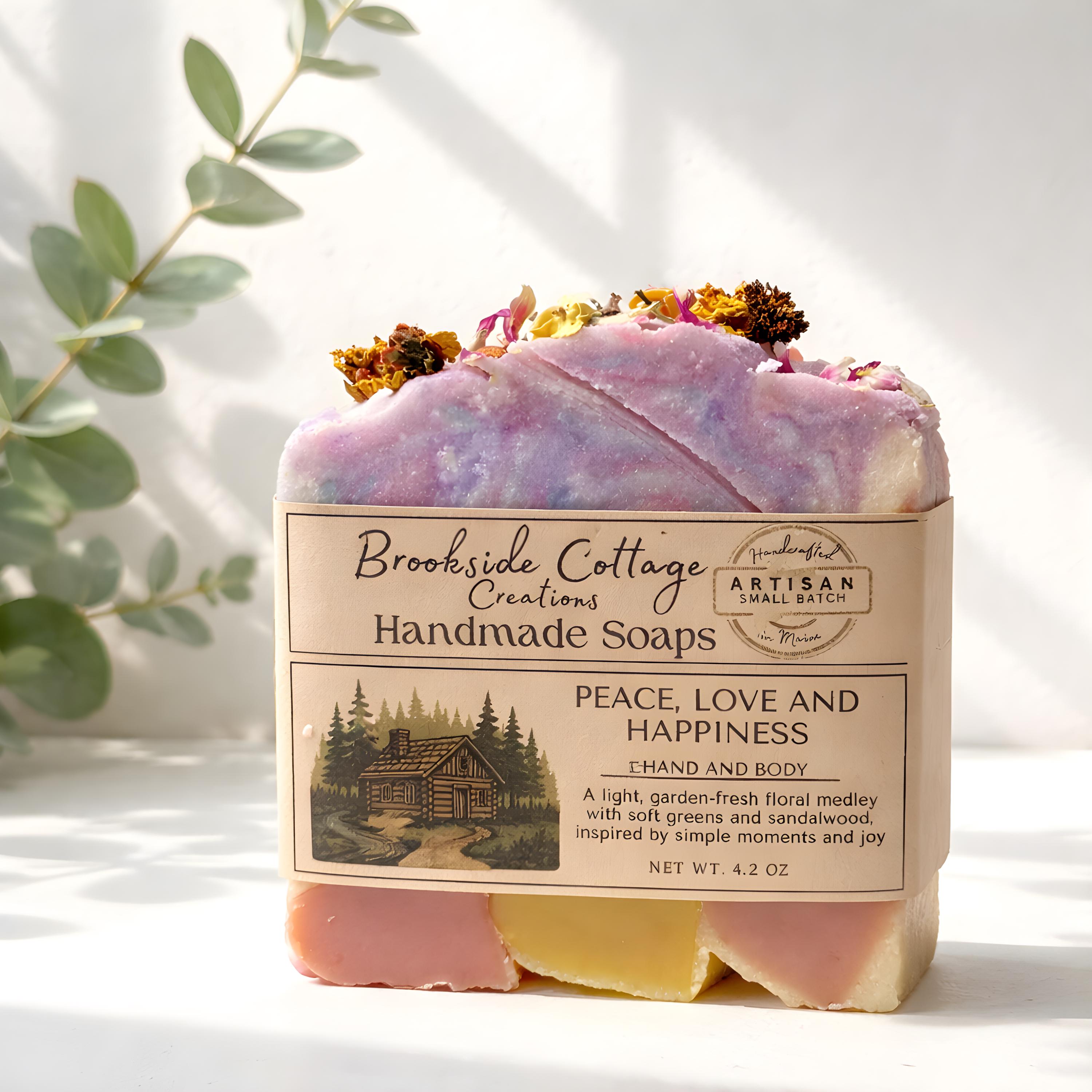 Discover the Peace, Love & Happiness Handmade Cold Process Artisan Soap Bar, a joyful Maine-made creation that celebrates calm, balance, and simple pleasures. Crafted in small batches, this soap blends lily of the valley, neroli, and jasmine with fresh green notes and smooth sandalwood for a serene, feel-good fragrance.