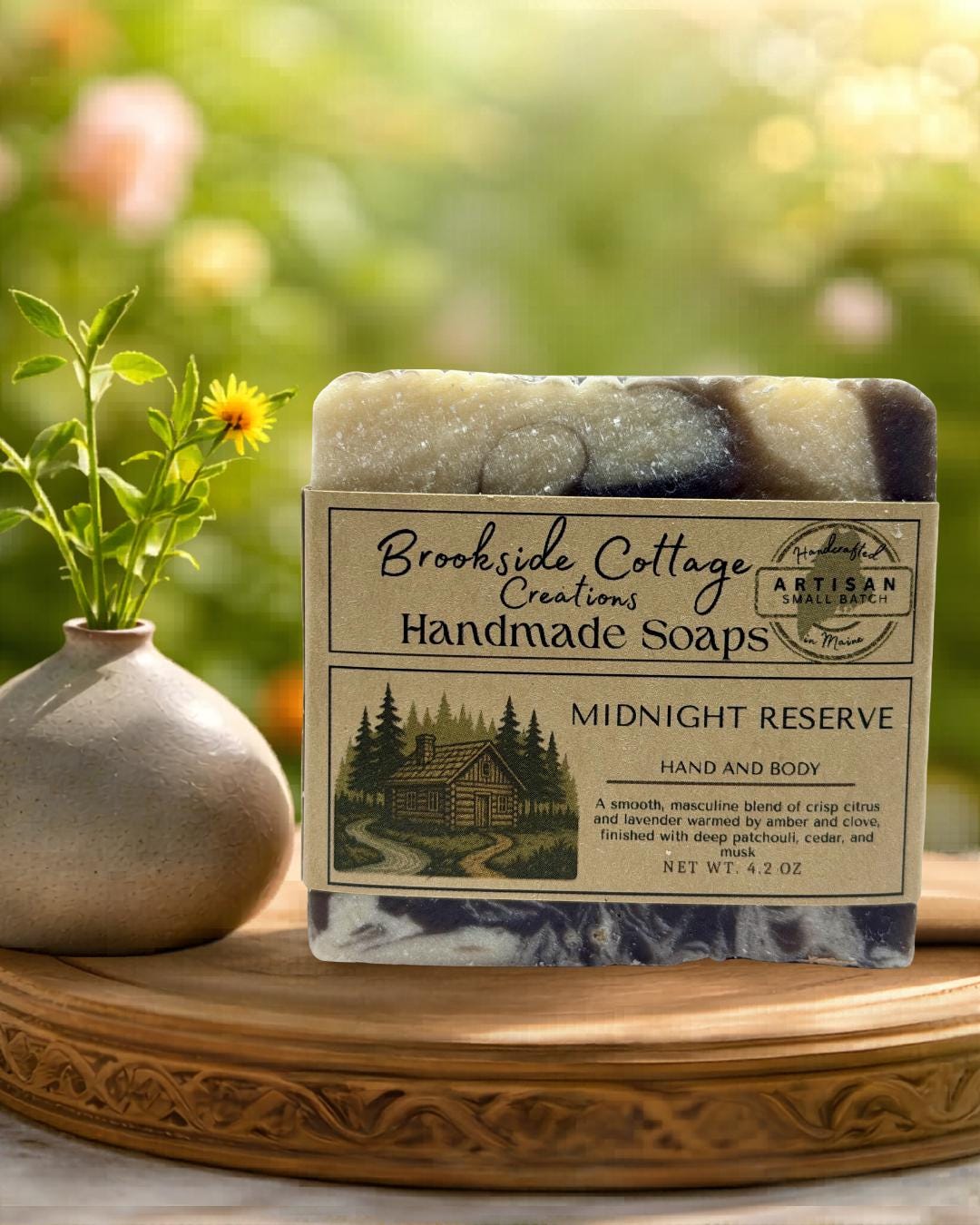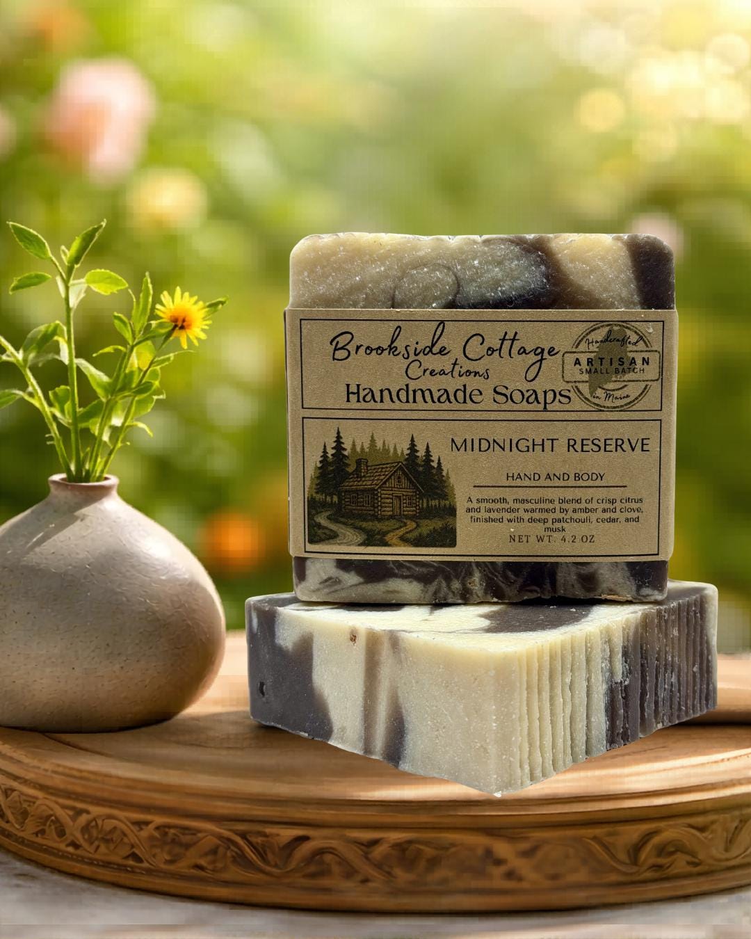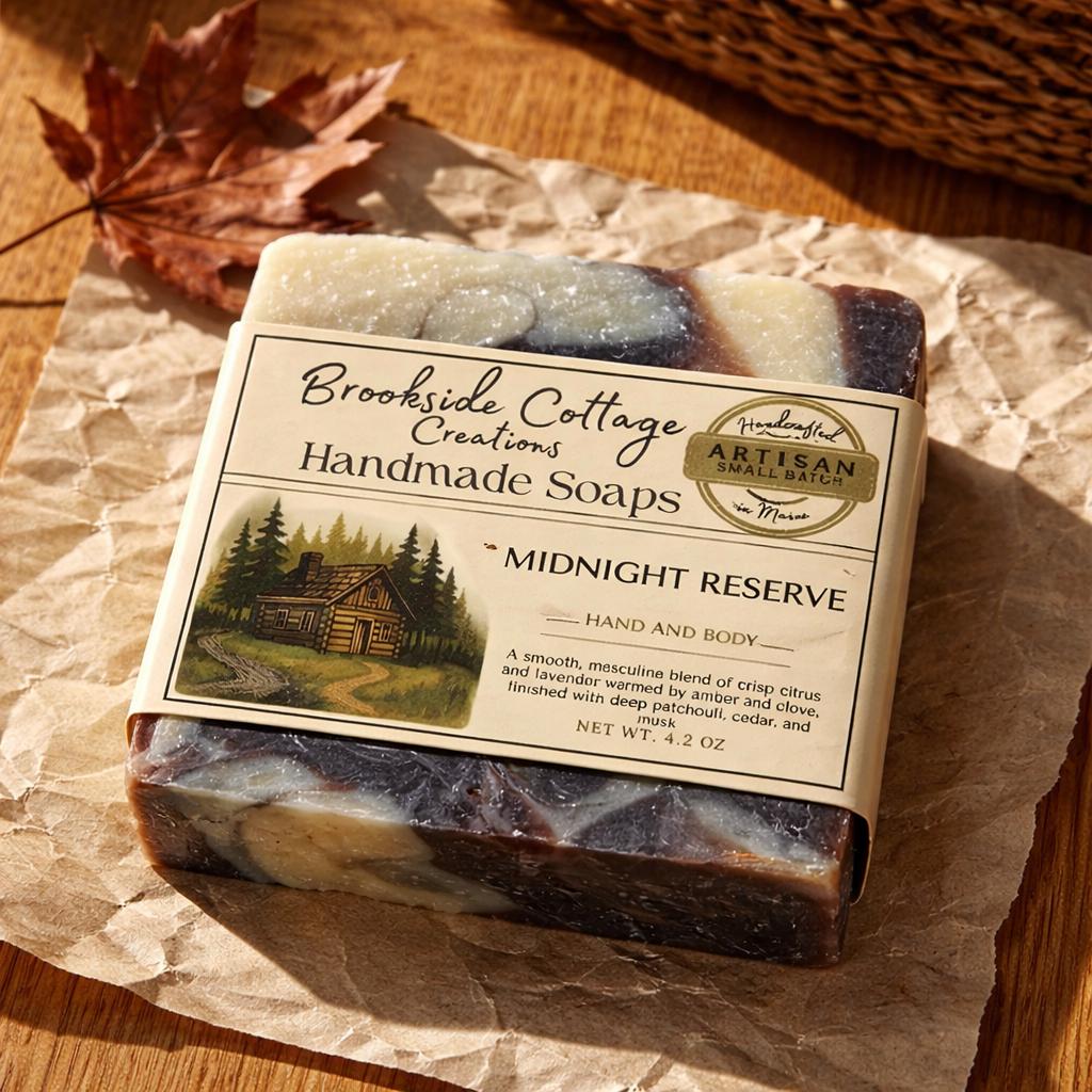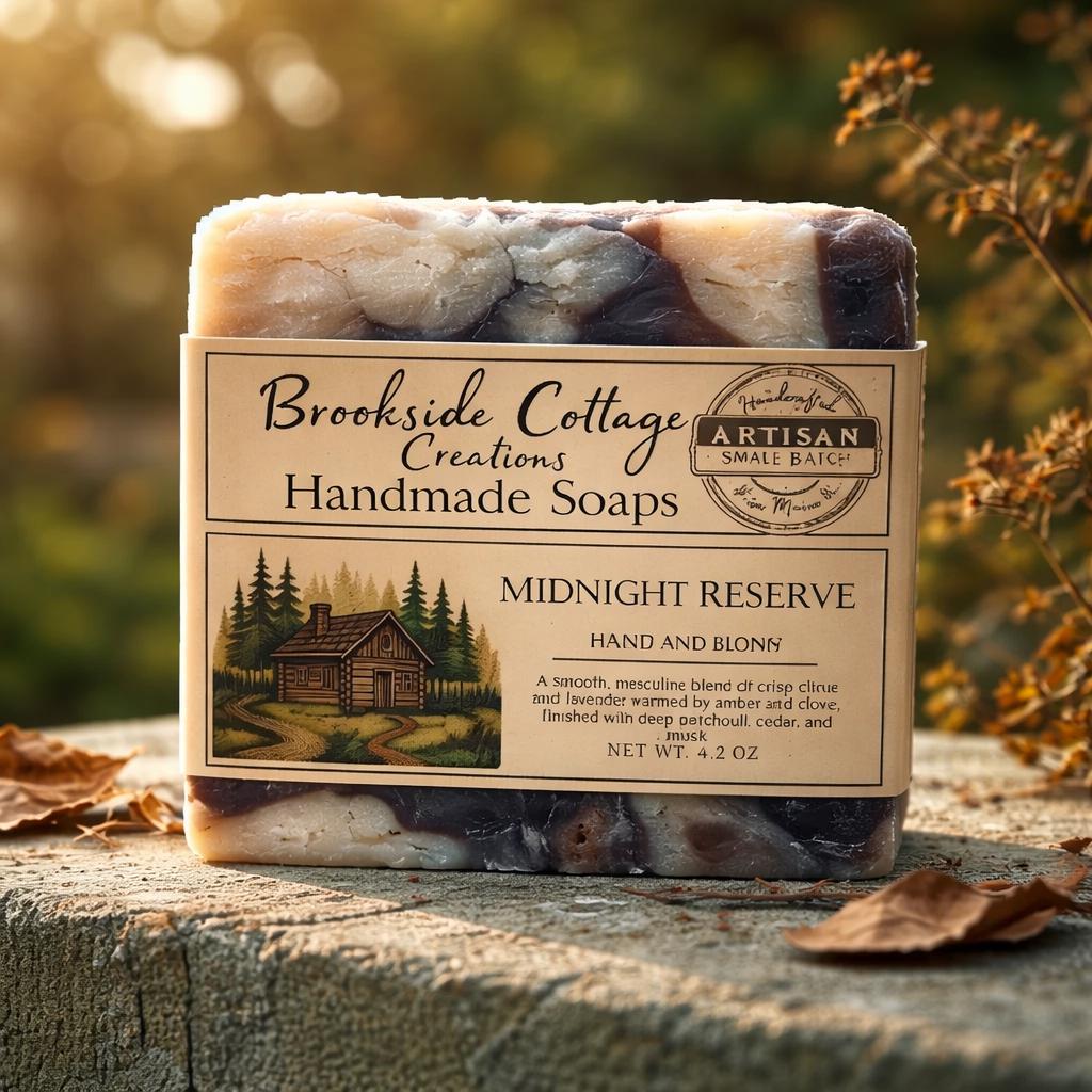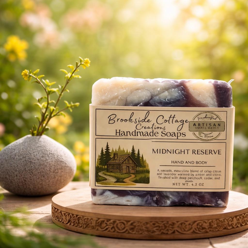 Discover the Midnight Reserve Handmade Cold Process Artisan Soap Bar, a refined Maine-made soap with a bold, masculine edge. Crafted in small batches, this sophisticated scent opens with crisp citrus and lavender, warmed by amber and clove, and finished with deep patchouli, cedar, and musk.